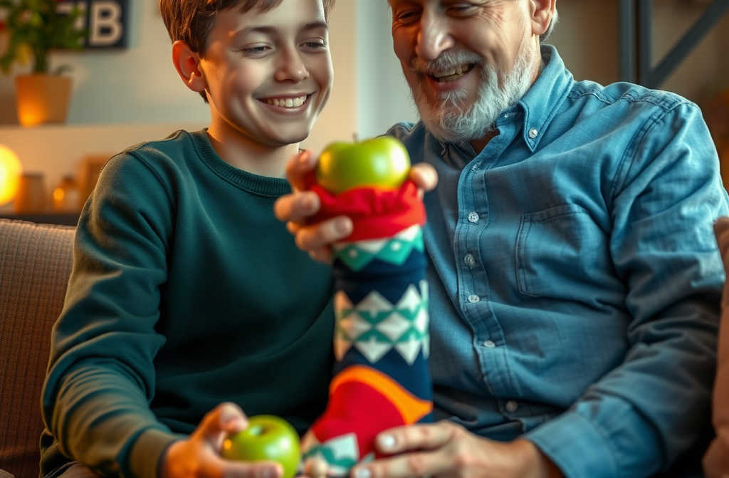כשהראל התבגר וסיים את לימודיו באוניברסיטה, מצא עבודה טובה, והוא לא שכח את סבא שלו לרגע. הוא המשיך לגור איתו ועם משפחתו הקטנה. ביום הולדתו האחרון, החליט להעניק לסבא גרב עם ציור של תפוח ירוק. סבא שלו התמלא שמחה והכריז כי עכשיו מופיע בכל יום תפוח קסום בגרב. הקשר המיוחד והקסום בין הראל לסבא שלו המשיך להיות חזק, מלא אהבה והכרת תודה למתנות הקטנות והמיוחדות שהם העניקו זה לזה.