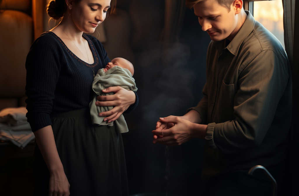 ליד הקיר עמדה עריסת תינוק, עגלה, ובתוכה בגדים יפים לתינוק. איתי, יושב ליד השולחן, ראשו על ידיו, ישן.