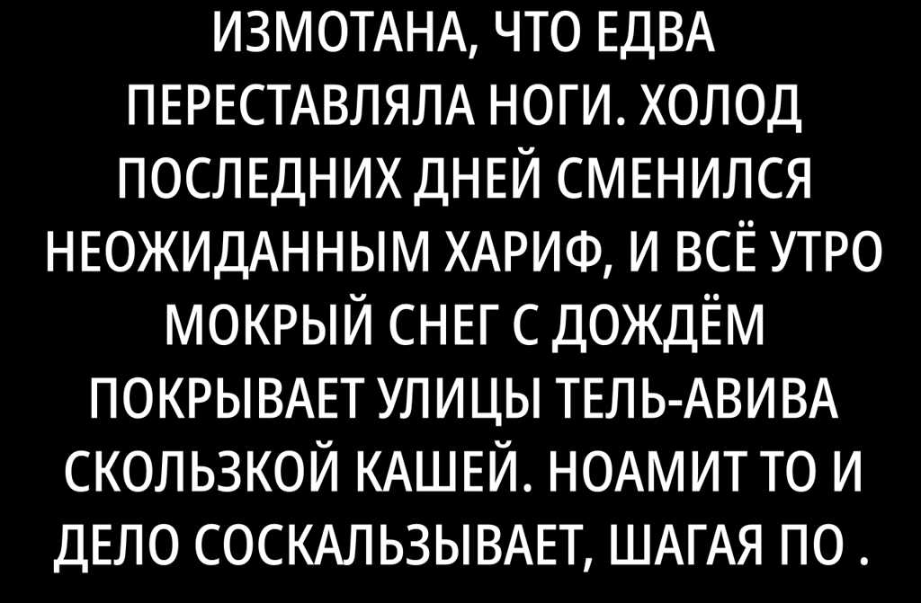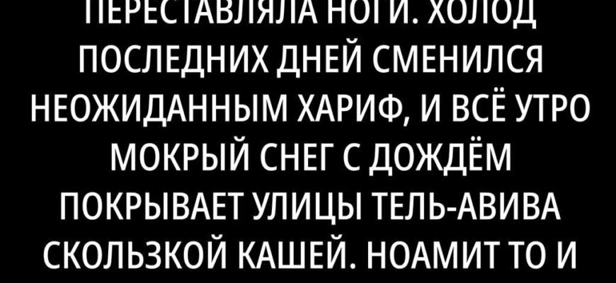 После ночного дежурства Ноамит была настолько измотана, что едва переставляла ноги. Холод последних дней сменился неожиданным хариф, и всё утро мокрый снег с дождём покрывает улицы Тель-Авива скользкой кашей. Ноамит то и дело соскальзывает, шагая по уютной улице в сторону дома.