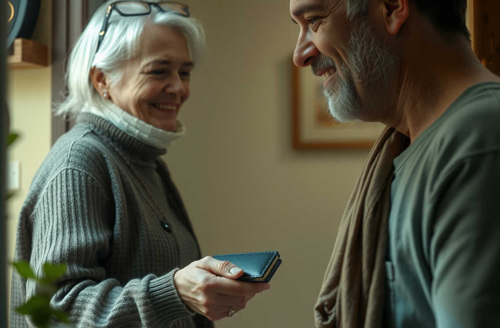 ירדתי במדרגות, הלב הולם בלי הפסקה. פתחתי את הדלת, ומולי עמד גבר קשיש, אולי בן שבעים. מסודר, עטוף במעיל כחול כהה, שיערו לבן. בידו החזיק את הארנק שלי.