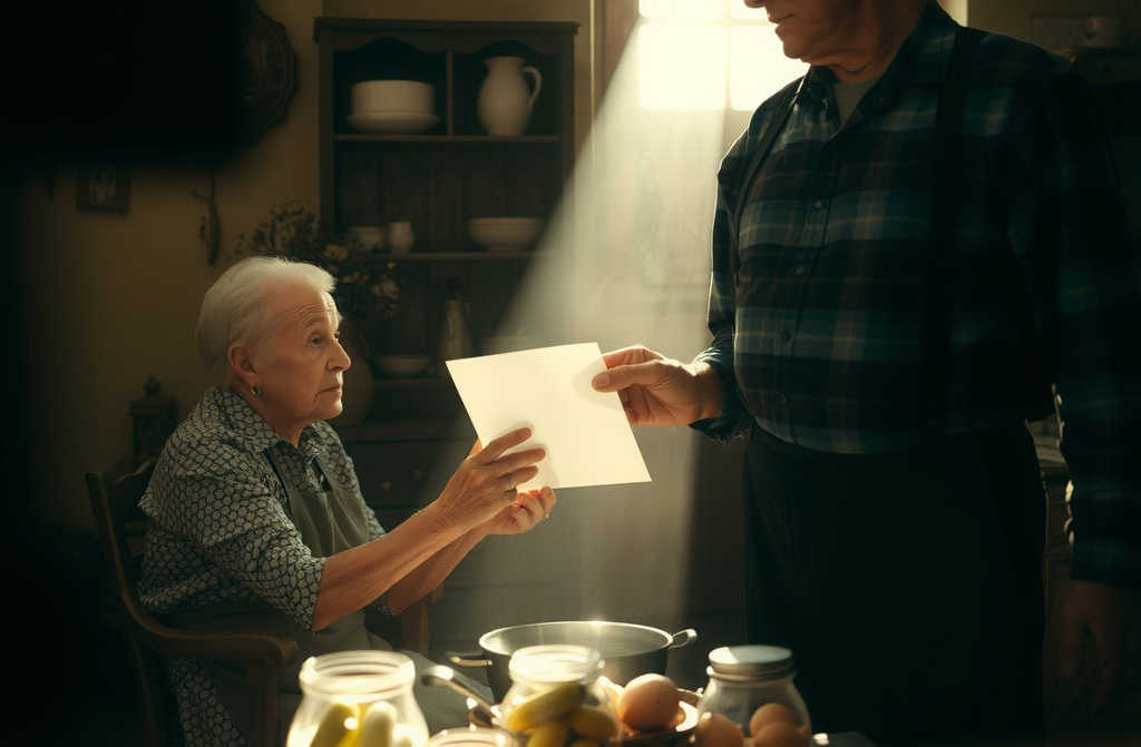 “את באת,” חייך חיים כשראה את השכנה הדסה, והזמין אותה לשולחן. ישבו, שתקו, נזכרו ברונה. פתאום שלף חיים מעטפה מהכיס.