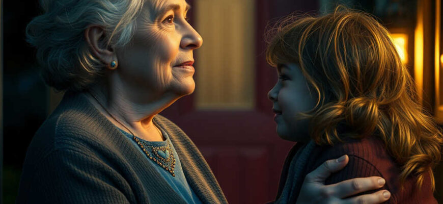 על המדרגה למטה עמדה אישה מבוגרת נמוכה, וחנוטה במעיל צמר ענק. פניה מלאות קמטים, אבל עיניה אפורות וחדות, צלולות כאילו יודעות הכול.