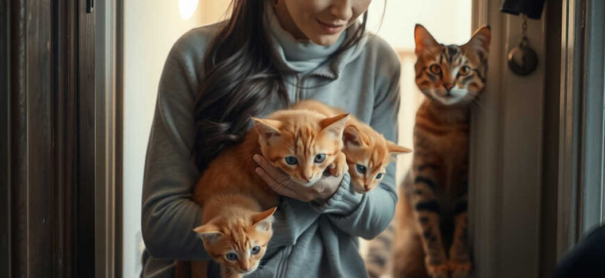 החתול נכנס בזהירות, בודק שהדיירת החדשה בסדר, אלה מכניסה פנימה את הקטנים. הוא, במקצועיות, מראה לגורים את המגש בכלליות של גננת.