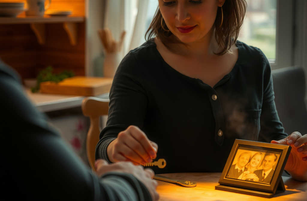 מאחוריי נשארו השקט, המפתח החלוד, ותמונה של משפחה מחייכת.