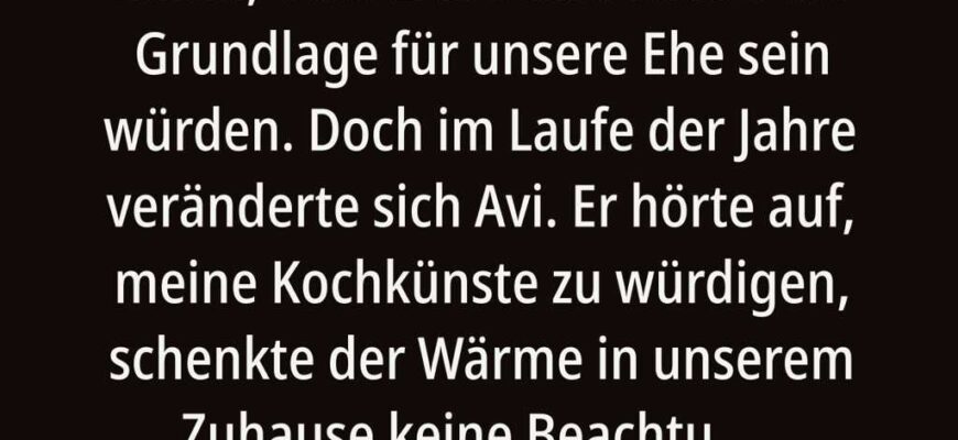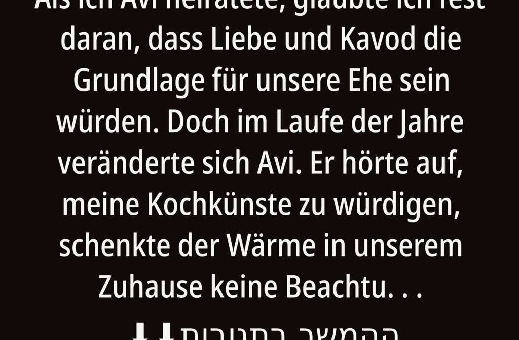 Als ich Avi heiratete, glaubte ich fest daran, dass Liebe und Kavod die Grundlage für unsere Ehe sein würden. Doch im Laufe der Jahre veränderte sich Avi. Er hörte auf, meine Kochkünste zu würdigen, schenkte der Wärme in unserem Zuhause keine Beachtung mehr und war bei jeder Gelegenheit voller Spott und Hohn.