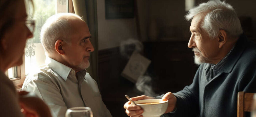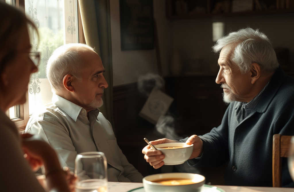 אותו זקן בדיוק, לוגם את המרק שלו לאט־לאט, כאילו כל כפית היא ניצחון קטן. אליאב גיחך בביטול וקרא למארחת: “גברת כשתסיים הזקן הזה את המרק הזול שלו, תני לי את השולחן. אין לי זמן. אני נדיב, תעבירי גם את החשבון על חשבוני.”