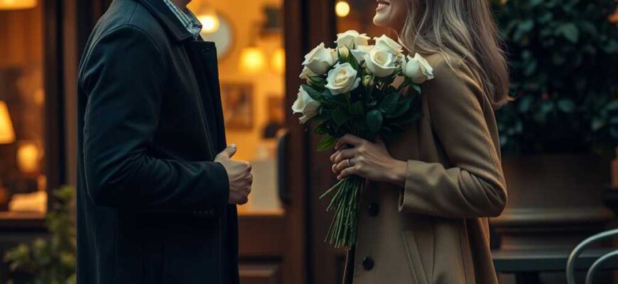 הוא ניגש אליה והגיש לה פרחים לבנים.