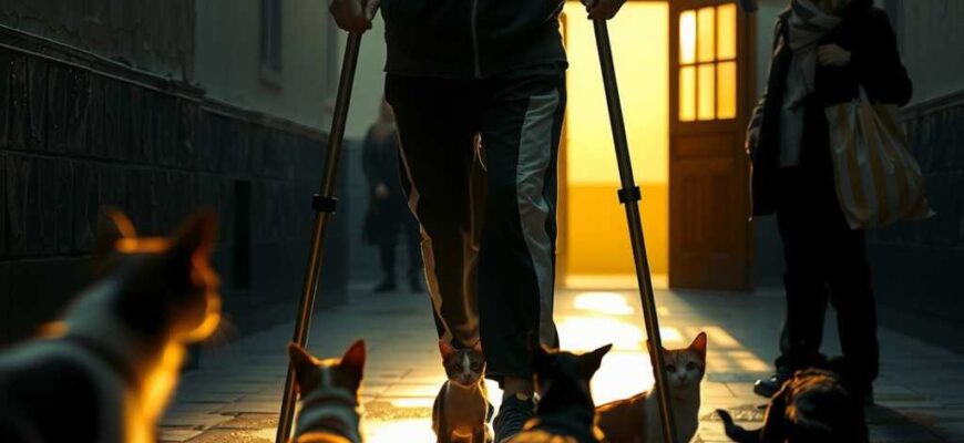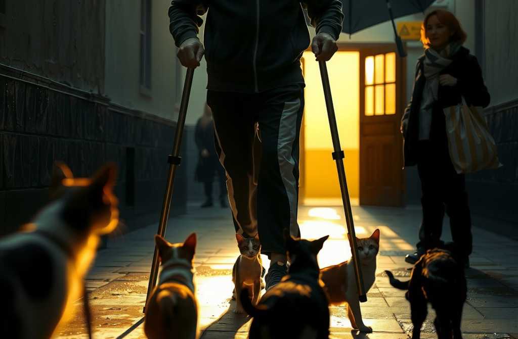 Жена принесла угощение, он взял и, наклонившись с болью, дал котику. Тот посмотрел в глаза мужчине на костылях и стал есть.