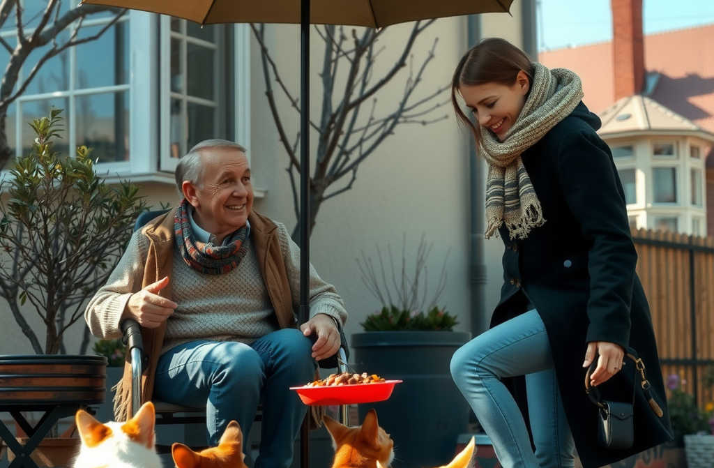 Они поели и начали бегать вокруг мужчины, будто приглашая его сыграть עם ними. Он злился и смеялся, но двигал ногу за ногой. Маленькие собачки радостно гавкали.