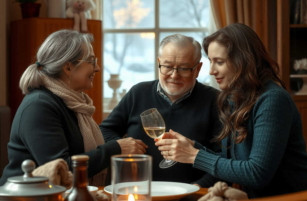 דלת הכניסה נטרקה. אורי נכנס כשהוא מנער גשם מהמקטורן. אחריו עמוס ואשתו אלה. הבית התמלא קולות, צחוקים, ק clinking הכלים. אלה הביאה עוגת גבינה, עמוס יין יקר. אורי חיבק אותי ונשק לרקתי.