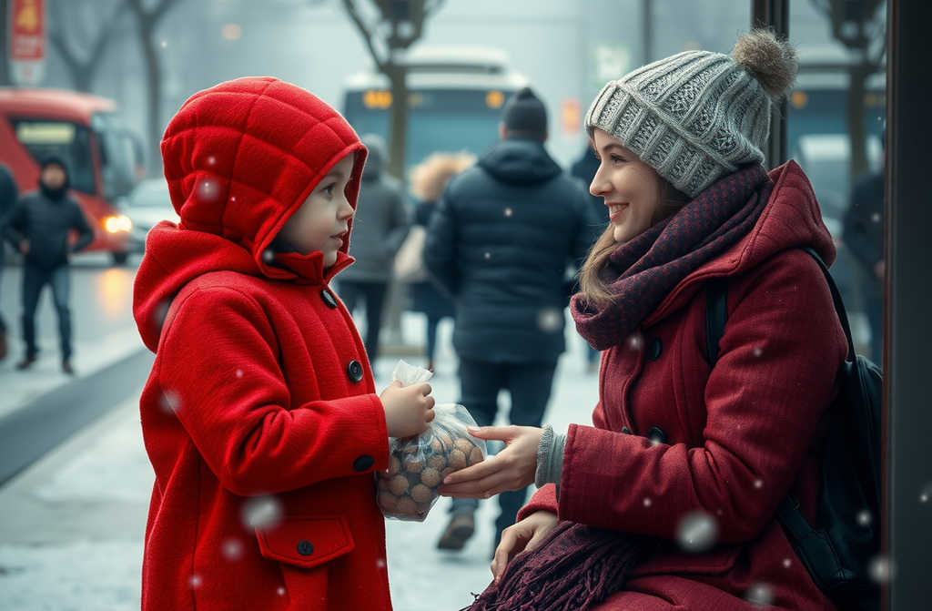 פתאום נעצרת מולה ילדה קטנה כבת ארבע במעיל חורפי, מחזיקה שקית נייר קטנה.