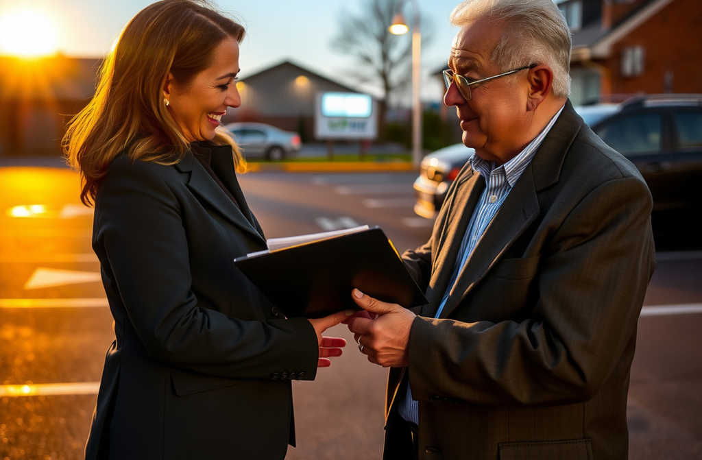 במקום להיכנס מיד לאוטו, שרון עוצרת. היא פותחת את תיק העור האישי שלה, שולפת ממנו קלסר קטן וכבד. היא ניגשת אל הזקן, מושיטה לו את הקלסר בחיוך חמים ומביטה ישר לעיניו: