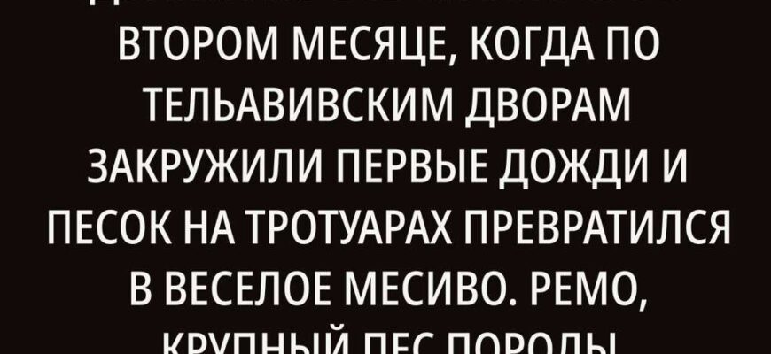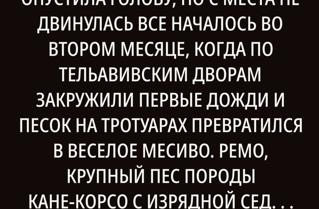 Молодая семья из квартиры номер двадцать три, Яарив и Шира, заехала сюда в конце лета. С собакой. Ремо встречал их каждый вечер у подъезда, подпрыгивал, лизал в ладонь, радовался жизни, как израильтянин в пятницу утром. Вернее, радовался.