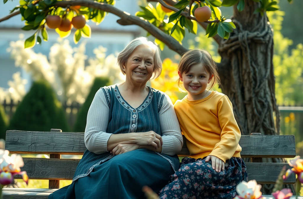 יושבות על הספסל, עץ התפוח מכוסה ירוק, דרור משתולל בענף.