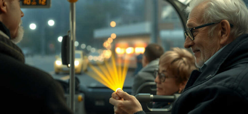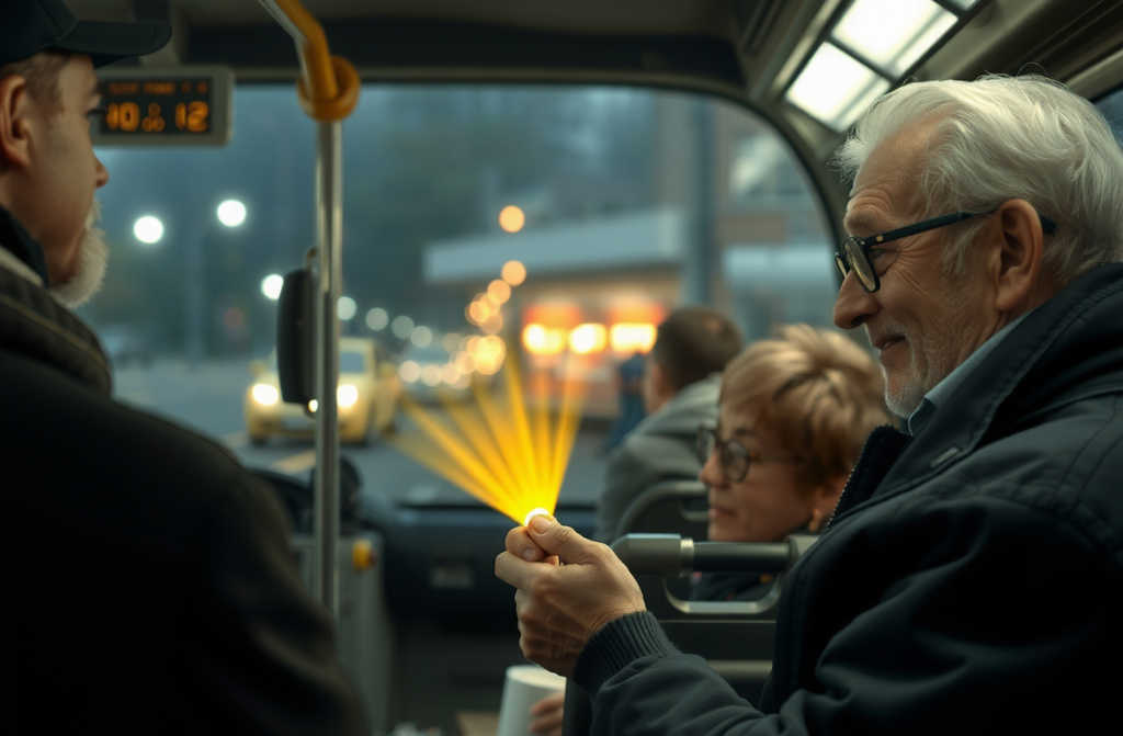 הוא לא ישן, לא קורא, לא בודק טלפון. אין אוזניות, אין עיתון. רק מסתכל בחלון ומסובב חפץ זעיר. במראה האחורית הבהב אור חלש, צהוב, שנעלם ושב. כאילו גחלילית נכנסה לאוטובוס ולא מוצאת את הדרך החוצה.
