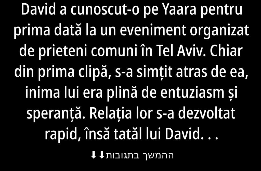 David a cunoscut-o pe Yaara pentru prima dată la un eveniment organizat de prieteni comuni în Tel Aviv. Chiar din prima clipă, s-a simțit atras de ea, inima lui era plină de entuziasm și speranță. Relația lor s-a dezvoltat rapid, însă tatăl lui David era îngrijorat. L-a avertizat că Yaara ar putea să nu fie sinceră și să fie interesată doar de avantajele materiale. David a respins această idee cu ușoară iritare, explicând că nici măcar nu-i spusese încă despre averea familiei sale. Totuși, tatăl său l-a sfătuit să păstreze acest secret cât mai mult pentru a se convinge de sinceritatea Yarei.