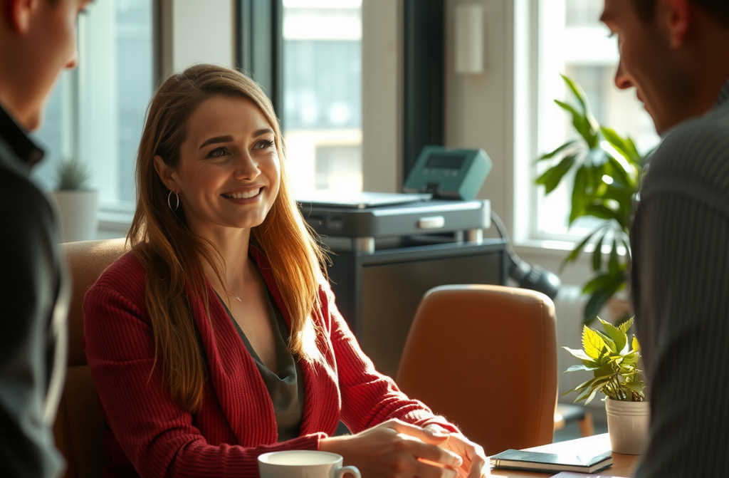 בעודה מעבירה עמודים, ניגש אליה רועי מנהל פרויקטים מהחדר ליד. הוא נשען על השולחן, מנפנף בחיוך רחב.