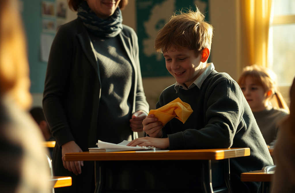 הכיתה רעשה וגעשה צחוקים, ניירות מקומטים, וריח של כריכים לחים שהתפשטו ברוח נעורים.