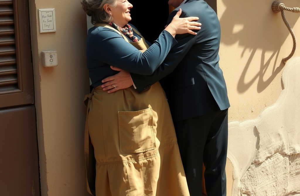מתוך הבית שומעים פסיעות כבדות ואיטיות, ואחריהן הדלת נפתחת וחושפת את נועה, אישה בת 52, שיער שיבה קל אסוף בקליפס, ידיים של מישהי שעבדה קשה כל החיים, ולבוש פשוט של עובדת בבית קפה שכונתי. היא נראית מופתעת לגמרי – מה לו ולמקום הזה?
