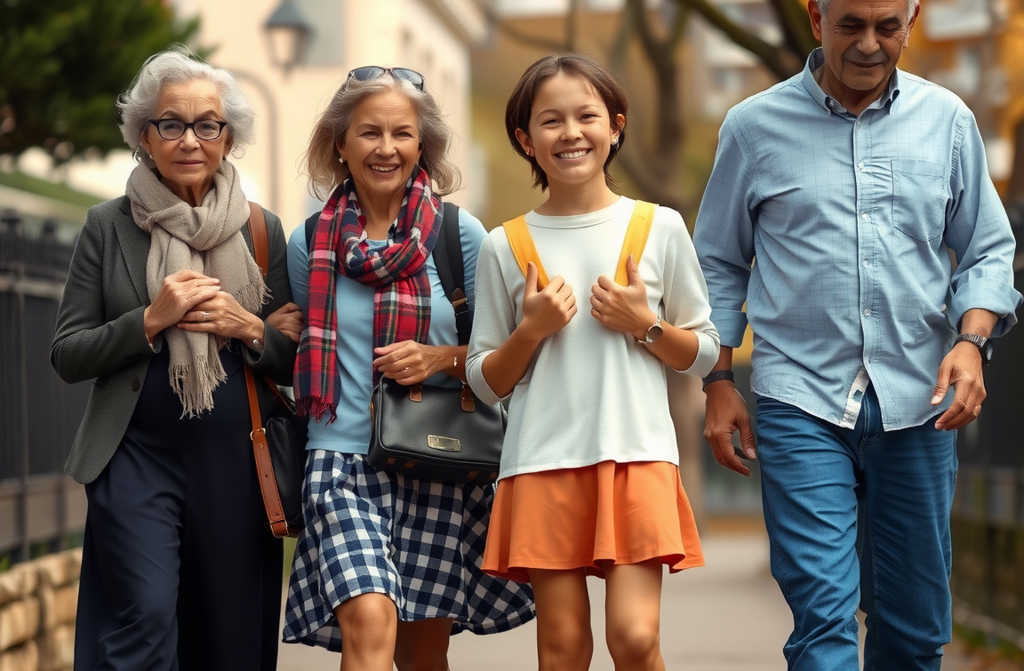 זקנה מחזיקה ילדה גבוהה ביד, ילקוט וזר ביד השנייה. אלמלא גובהה של הילדה היו חושבים שיעלה לכיתה א’. בפועל היא בדרך לכיתה ד’, אבל רק עכשיו, כי עד כה למדה מהבית. כל הציונים מצוינים.