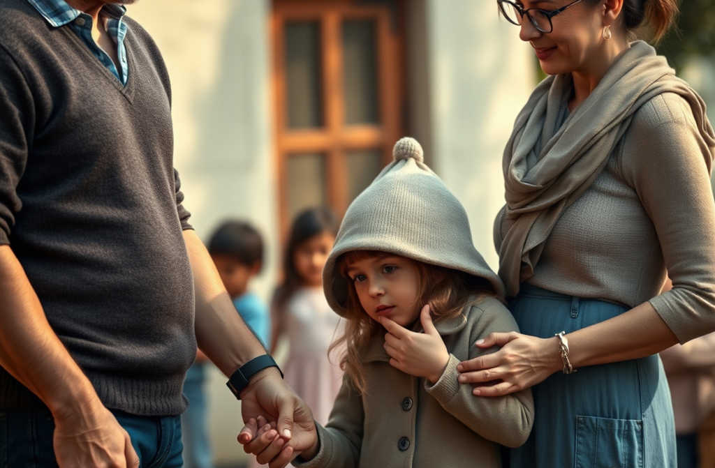 פתאום שקט נשבר ב-“אמא!”, כל הילדים הסתובבו יחד. ילדה קטנה בכובע עם פומפון רצה אלינו.