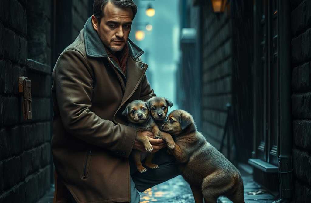 ניסיתי לפתוח את הקשר, הוא היה חזק, חורש, ועם תנועה של ידיי, נפתח. פתאום, צליל חלש, כמו ניבוי של ציפור צעירה, נשמע מתוך הפח. הלב שלי קפץ. קרעתי את הפח ונתתי אור פנימה. בתחתית, קיבצתי חבילה רטובה של שני גורים קטנים, עיוורים, רטובים, מכוסים בבוץ, אבל הם נושמים. לקחתי אחד על כף היד, הרגשתי אותו שוקל כמו חיבוק קטן. לאט, לקחתי את השני והצמדתי אותם אל חזה, תחת המעיל, כדי לחמם אותם במגע שלי. הלב שלי פעם מהר יותר, קצב עם הלב שלהם.