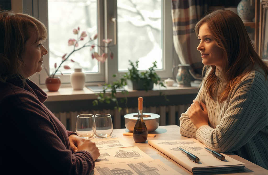 יושבות במטבח. הִלֵּל מוזגת יין לשתי כוסות פשוטות רק גביע אחד יש לה, וַמרים מעדיפה ככה.