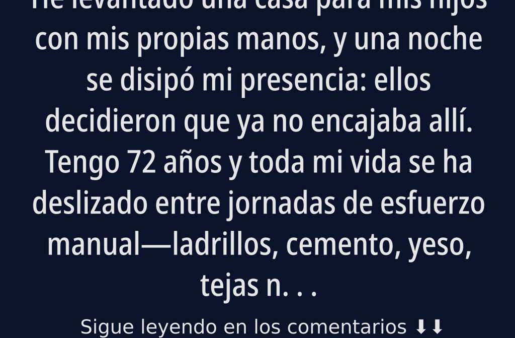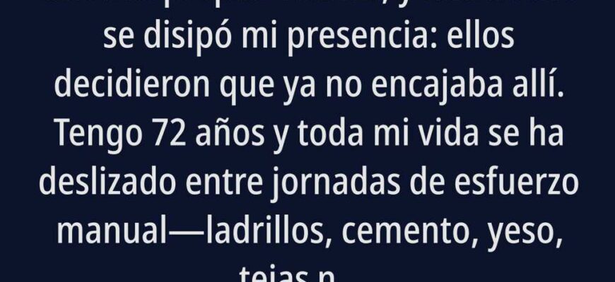 He levantado una casa para mis hijos con mis propias manos, y una noche se disipó mi presencia: ellos decidieron que ya no encajaba allí. Tengo 72 años y toda mi vida se ha deslizado entre jornadas de esfuerzo manualladrillos, cemento, yeso, tejas naranjas bajo un sol suave de Castilla. Allí encontré mi fuerza y mi verdadero oficio.