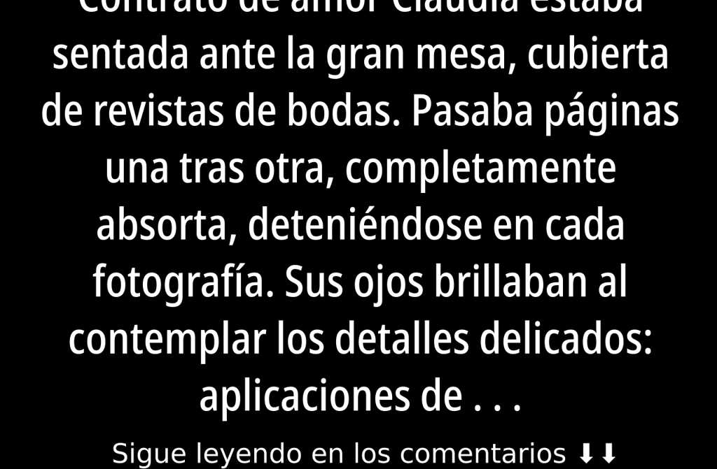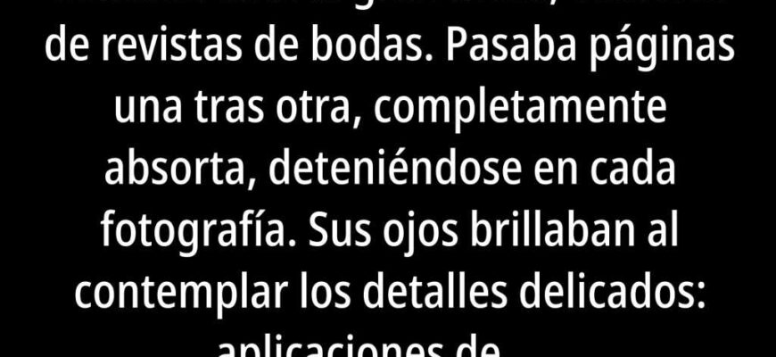 Claudia estaba sentada ante la gran mesa, cubierta de revistas de bodas. Pasaba páginas una tras otra, completamente absorta, deteniéndose en cada fotografía. Sus ojos brillaban al contemplar los detalles delicados: aplicaciones de encaje, bordados finísimos, velos etéreos. Se paraba largo rato en los vestidos blancos e imaginaba cómo le quedarían puestos. En esos instantes, sentía crecer una cálida anticipación en el pecho: se veía a sí misma caminando hacia el altar, con todas las miradas fijas en ella, los familiares emocionados y expectantes