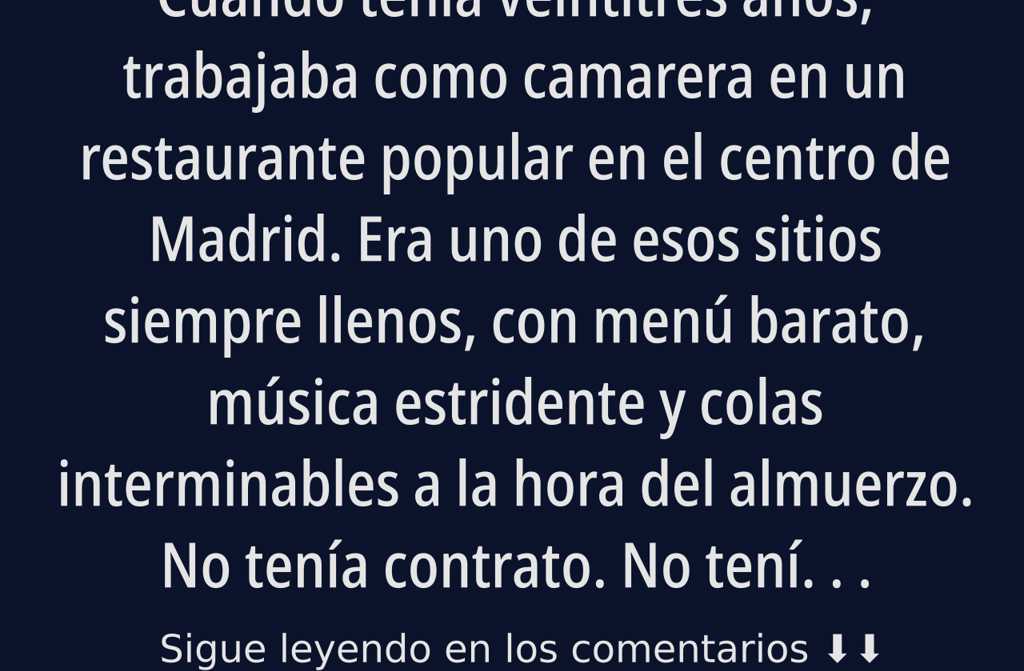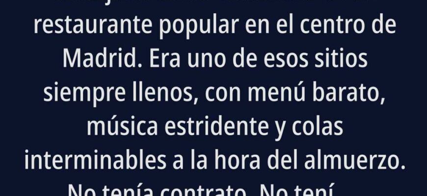 Cuando tenía veintitrés años, trabajaba como camarera en un restaurante popular en el centro de Madrid. Era uno de esos sitios siempre llenos, con menú barato, música estridente y colas interminables a la hora del almuerzo. No tenía contrato. No tenía Seguridad Social. No tenía absolutamente nada. Me pagaban por día. Si faltaba, no cobraba. Si enfermaba, a nadie le importaba. A pesar de todo, era la primera en llegar y la última en irme. Sabía los pedidos de memoria, soportaba clientes groseros, limpiaba mesas cansada y con el estómago vacío, pero necesitaba ese dinero.