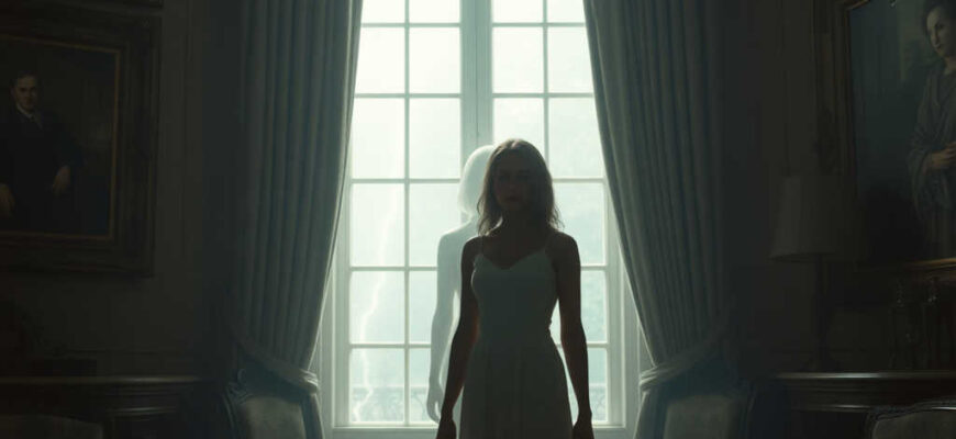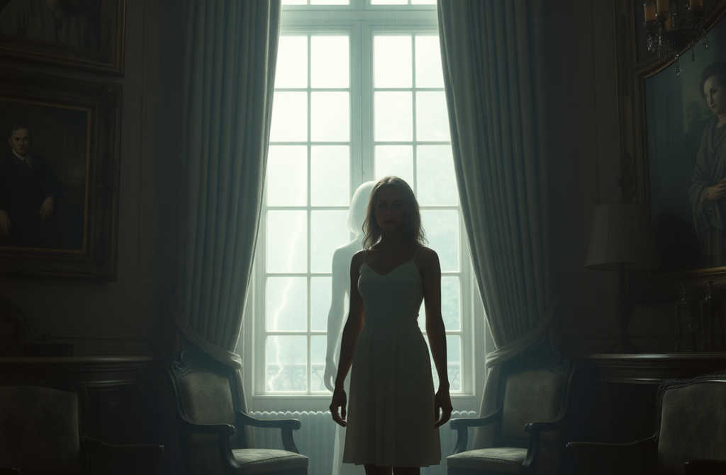 Un trueno la despertó. Un relámpago iluminó la habitación y entonces la vio: una anciana de pie frente a ella. Su marido seguía dormido, pero ella, paralizada, no pudo decir ni una palabra.