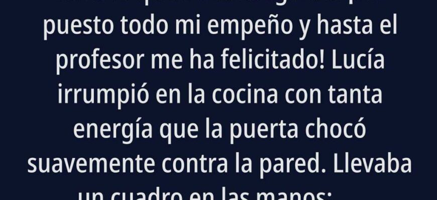 Lucía irrumpió en la cocina con tanta energía que la puerta chocó suavemente contra la pared. Llevaba un cuadro en las manos; no simplemente lo llevaba, sino que lo portaba frente a sí, con solemnidad, como si sujetara un jarrón valiosísimo. Su rostro brillaba de alegría: las mejillas encendidas por la emoción y los ojos tan brillantes que parecía que reflejaran el mundo fantástico que ella misma acababa de plasmar.