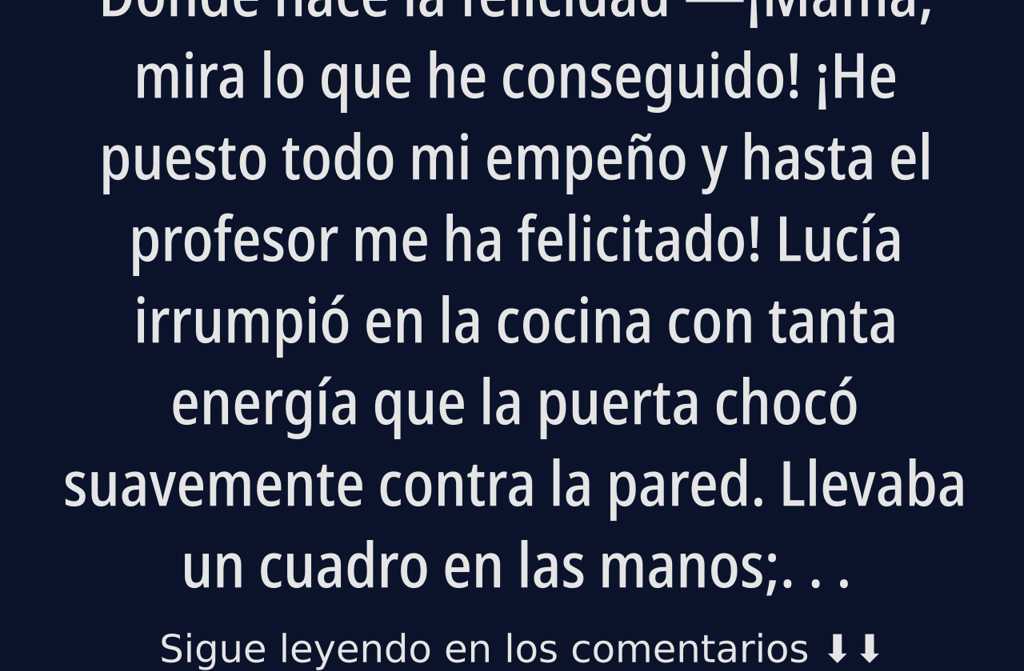 Lucía se detuvo, sorprendida por la felicitación. Había trabajado mucho en ese cuadro, meditando cada trazo, cuidando cada color, deseando de corazón que gustara. Cuando su madre terminó de admirarlo, abrazó el lienzo contra su pecho y fue al salón. Sofía se levantó y la siguió, caminando con paso cauteloso.