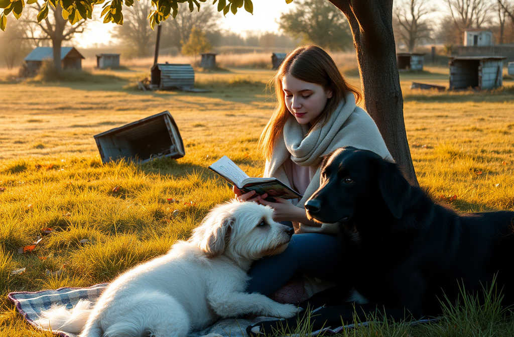 Nika llevaba una manta, la extendía bajo el manzano y leía. Lulú y Trueno, tras cansarse, se acostaban a su lado, hocico con hocico. A veces Doña Carmen se unía traía pastas, se sentaba al borde de la manta y contaba historias. A Nika le encantaba escucharla la anciana vivía sola, su hijo y su nieto la visitaban poco. El perro se había convertido en su compañía hacía cinco años, cuando le dijeron que sería pequeño… pero creció como un gigante.