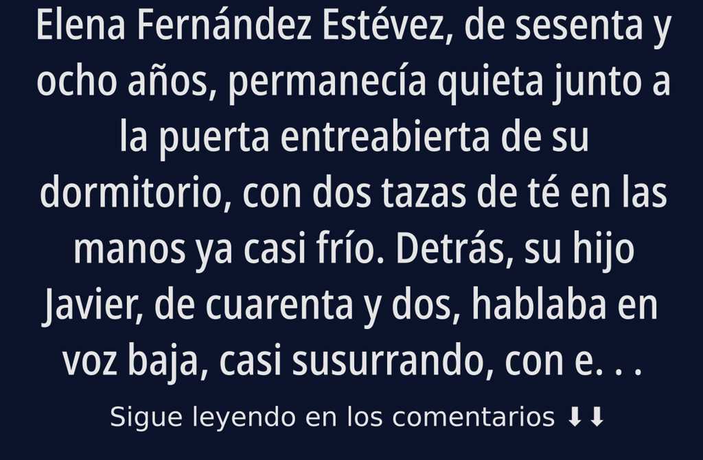 Elena Fernández Estévez, de sesenta y ocho años, permanecía quieta junto a la puerta entreabierta de su dormitorio, con dos tazas de té en las manos ya casi frío.