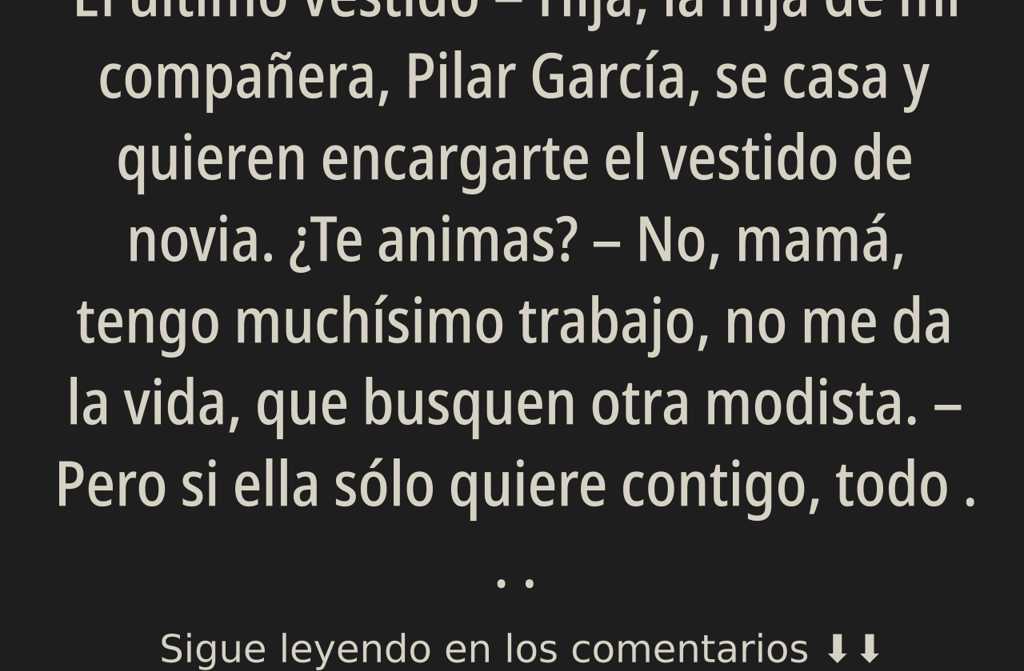 Dos días después, el vestido estaba terminado. Nunca había cosido tan rápido ni con tanta facilidad, como si alguien la guiara. Al vestir al maniquí, no pudo evitar admirar su propia obra. Qué pena que Inés no pudiera estrenar ese vestido en vida…