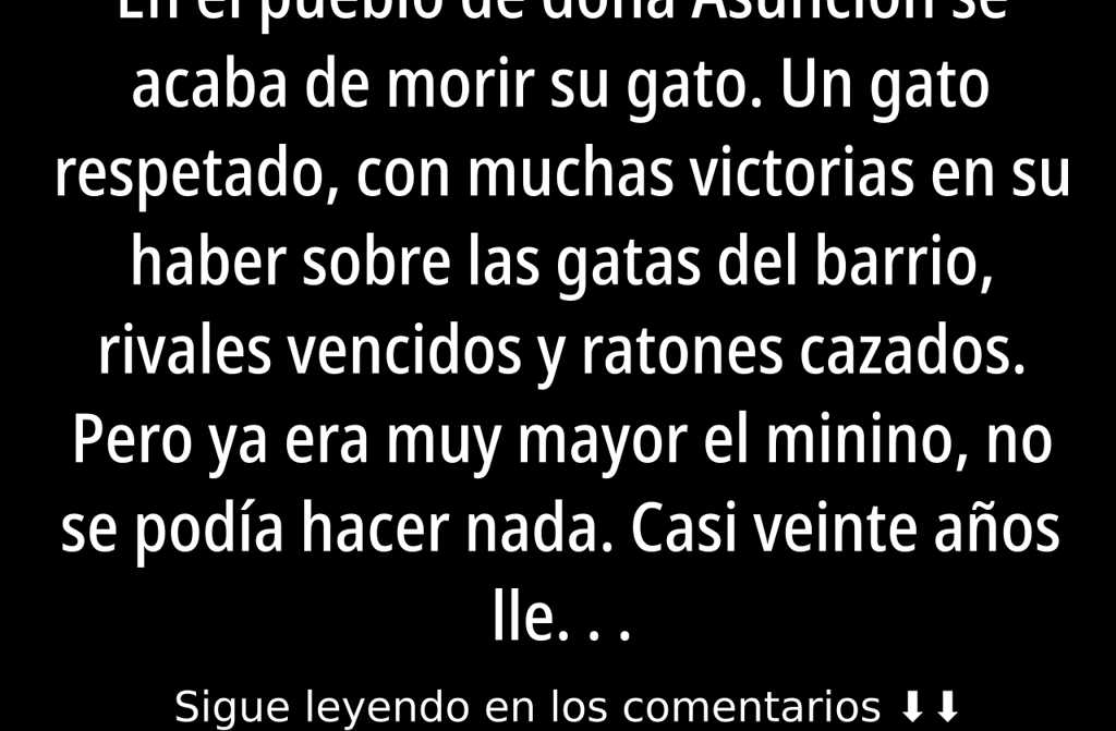 En el pueblo de doña Asunción se acaba de morir su gato. Un gato respetado, con muchas victorias en su haber sobre las gatas del barrio, rivales vencidos y ratones cazados. Pero ya era muy mayor el minino, no se podía hacer nada. Casi veinte años llevaba el felino rondando por este mundo, sin una puesta a punto a fondo.