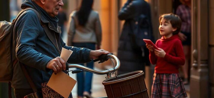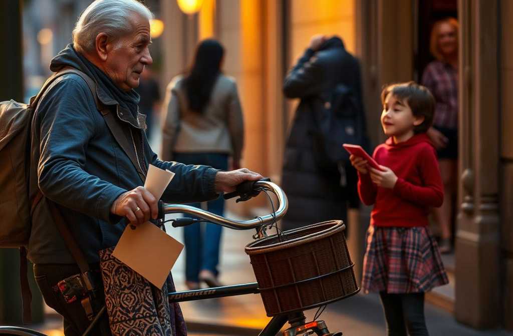 Una tarde de lluvia suave, Javier llegó a un edificio viejo. Una niña lo esperaba en la puerta. Le dio un dibujo: un sol sonriente sobre una bici oxidada. La pequeña le sonrió, y Javier se inclinó un poco. No hacían falta palabras. Solo un gesto, un instante de conexión silenciosa, bastaba.