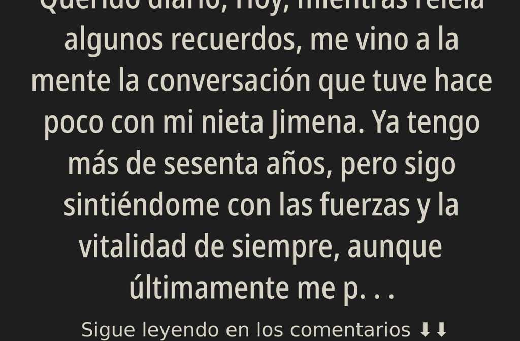 Hoy, mientras releía algunos recuerdos, me vino a la mente la conversación que tuve hace poco con mi nieta Jimena. Ya tengo más de sesenta años, pero sigo sintiéndome con las fuerzas y la vitalidad de siempre, aunque últimamente me pesa un asunto que no consigo despejar de mi alma.