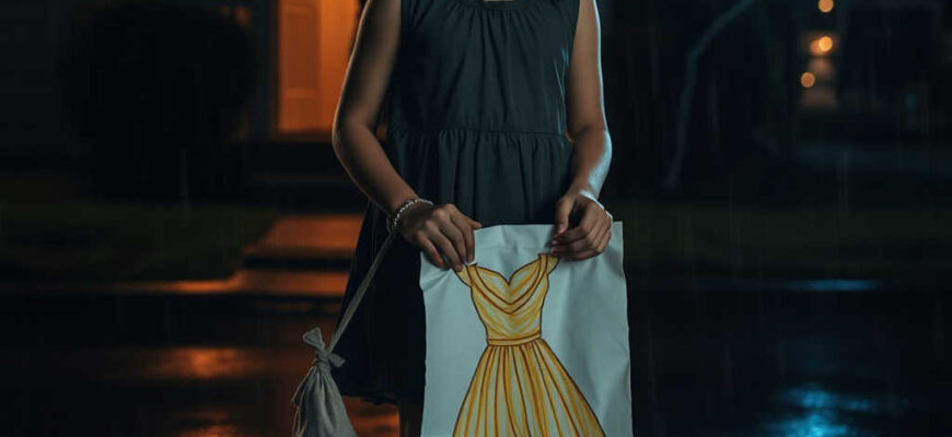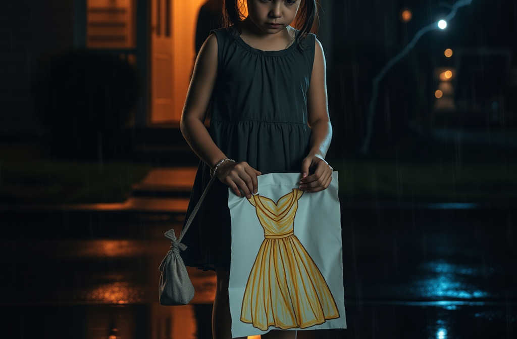 Tras ella, la voz aguda de Violeta resuena entre el trueno. «¡Fuera! No alimentaré a una parásita inválida». Un relámpago ilumina la figura diminuta que resbala por la acera. No hay techo, nadie que la reconozca como hija, sólo la frágil certeza de que Dios sigue mirando. Un espejo se rompe junto al camino, la lluvia se mezcla con la sangre de su rodilla. En sus manos temblorosas aprieta un dibujo empapado: un vestido bordado con hilos de oro.