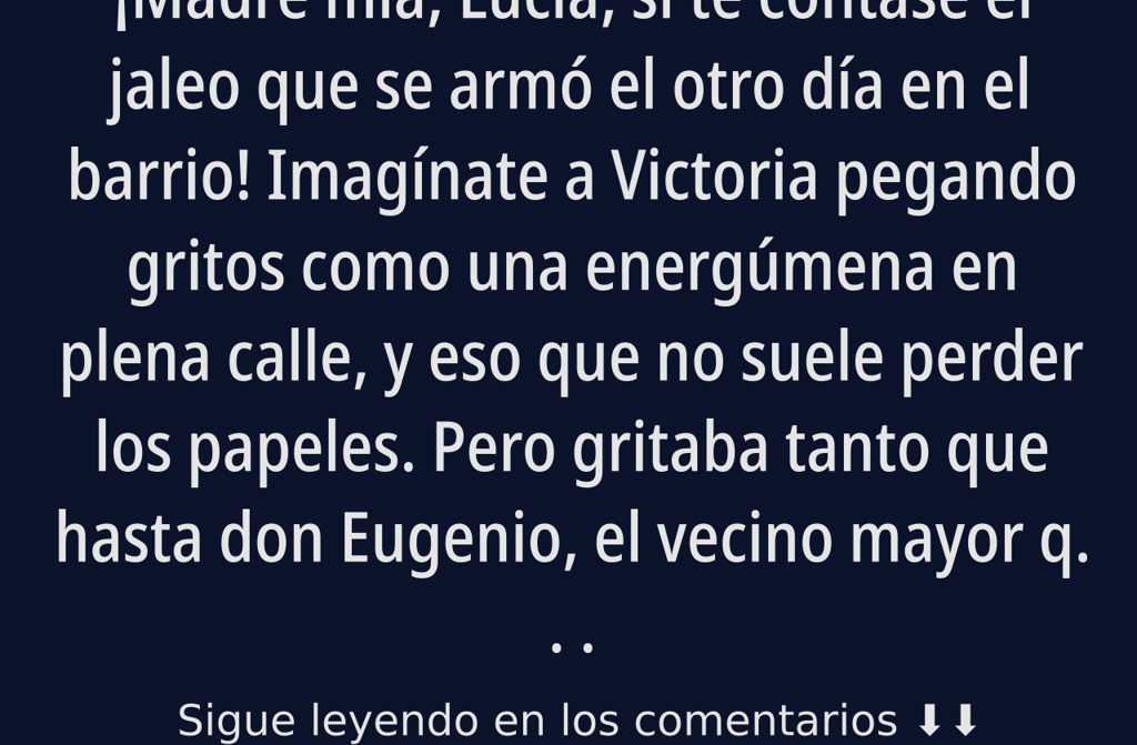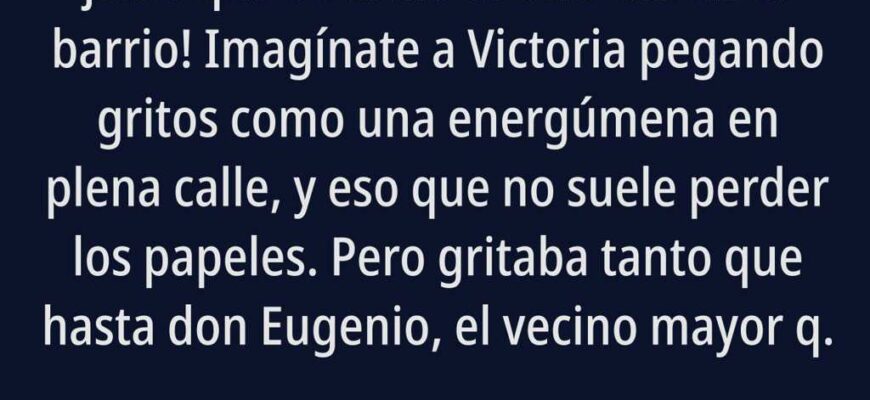 ¡Madre mía, Lucía, si te contase el jaleo que se armó el otro día en el barrio! Imagínate a Victoria pegando gritos como una energúmena en plena calle, y eso que no suele perder los papeles. Pero gritaba tanto que hasta don Eugenio, el vecino mayor que apenas oye y siempre está trasteando en su trastero, salió a mirar a ver qué pasaba. Si él se asoma, imagínate el escándalo.