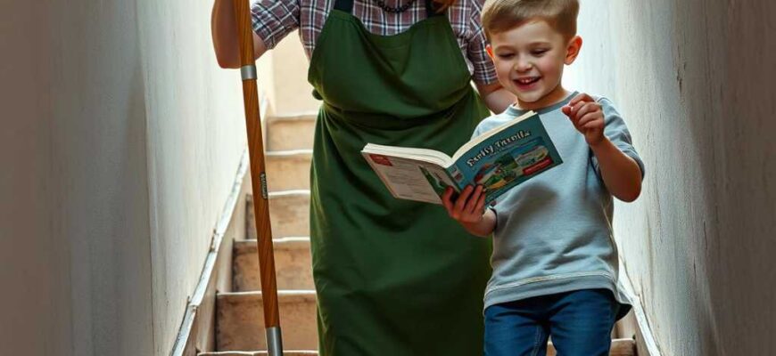 Después del cole, la tomaba de la mano y se dirigían juntos a los bloques que ella cuidaba. En una mano llevaba la cola del fregón, en la otra los dedos cálidos de Álvaro. Él ya conocía el ritmo: ella limpiaba los pasamanos, él abría las casillas de correos y las cerraba con delicadeza, como si fueran libros esperando ser leídos. Cuando se cansaba, se sentaba en una escalera y leía en voz alta su libro favorito. Sus palabras llenaban la casa de escaleras con una música sencilla y pura.