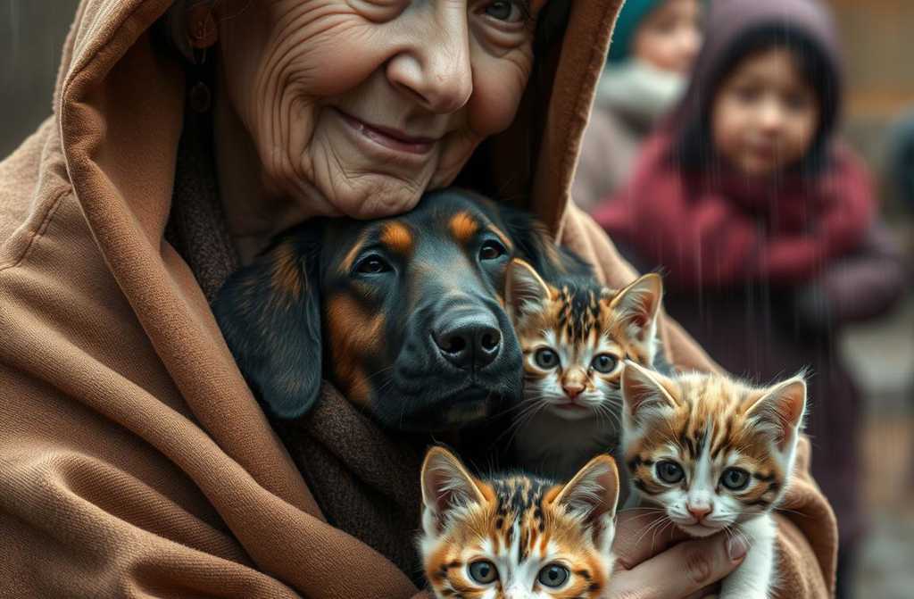 Corgi se acurrucó contra ella; Bigotes le rozó la mano suavemente. La mujer los acarició y susurró: