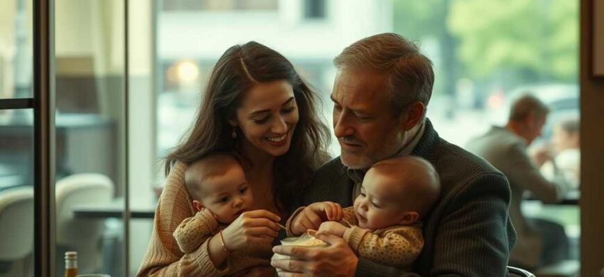 Lucía se quedó paralizada, el tenedor suspendido en el aire, y volvió la cabeza hacia un hombre arrodillado junto a su mesa. No tendría más de treinta y cinco años, pero la vida lo había marcado. Sobre su pecho, sujetos con un trozo de tela, llevaba dos bebés, sus caritas pálidas y ojerosas. Vestía unos vaqueros rotos y una camiseta raída, manchada de sudor. Temblaba, no de miedo, sino de cansancio. Pero en sus ojos no había vergüenza, solo el amor desesperado de un padre.