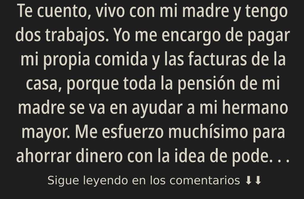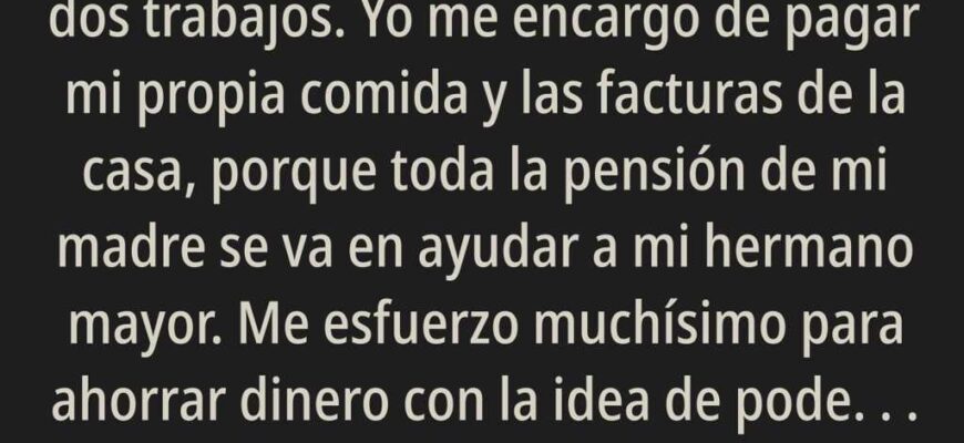 Te cuento, vivo con mi madre y tengo dos trabajos. Yo me encargo de pagar mi propia comida y las facturas de la casa, porque toda la pensión de mi madre se va en ayudar a mi hermano mayor. Me esfuerzo muchísimo para ahorrar dinero con la idea de poder comprarme un piso propio, y te aseguro que encontrar el equilibrio entre pagar todos los gastos y guardar lo suficiente para ese sueño es complicado. Pero, a pesar de todo, sigo comprometida con mi objetivo, trabajando duro y siendo disciplinada.