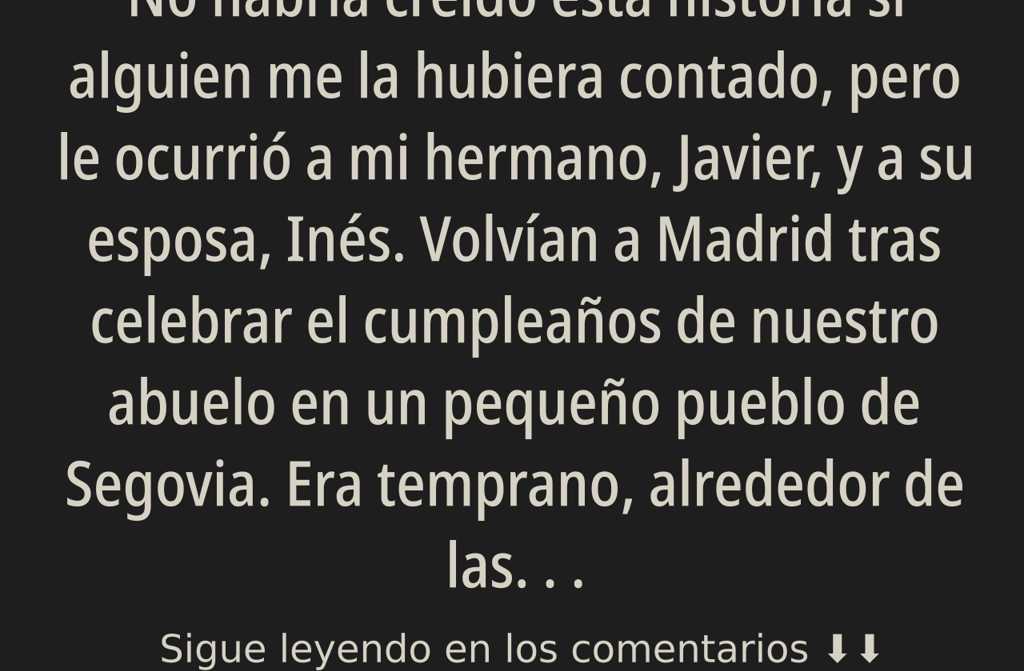 No habría creído esta historia si alguien me la hubiera contado, pero le ocurrió a mi hermano, Javier, y a su esposa, Inés. Volvían a Madrid tras celebrar el cumpleaños de nuestro abuelo en un pequeño pueblo de Segovia. Era temprano, alrededor de las siete de la tarde. Conduciendo por la autovía, vieron a una joven en mitad de la carretera. Estaba desesperada, agitando los brazos para detener el coche.
