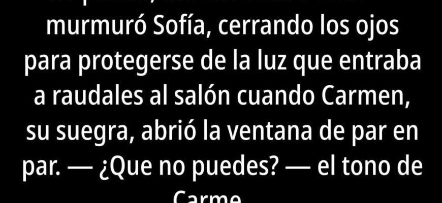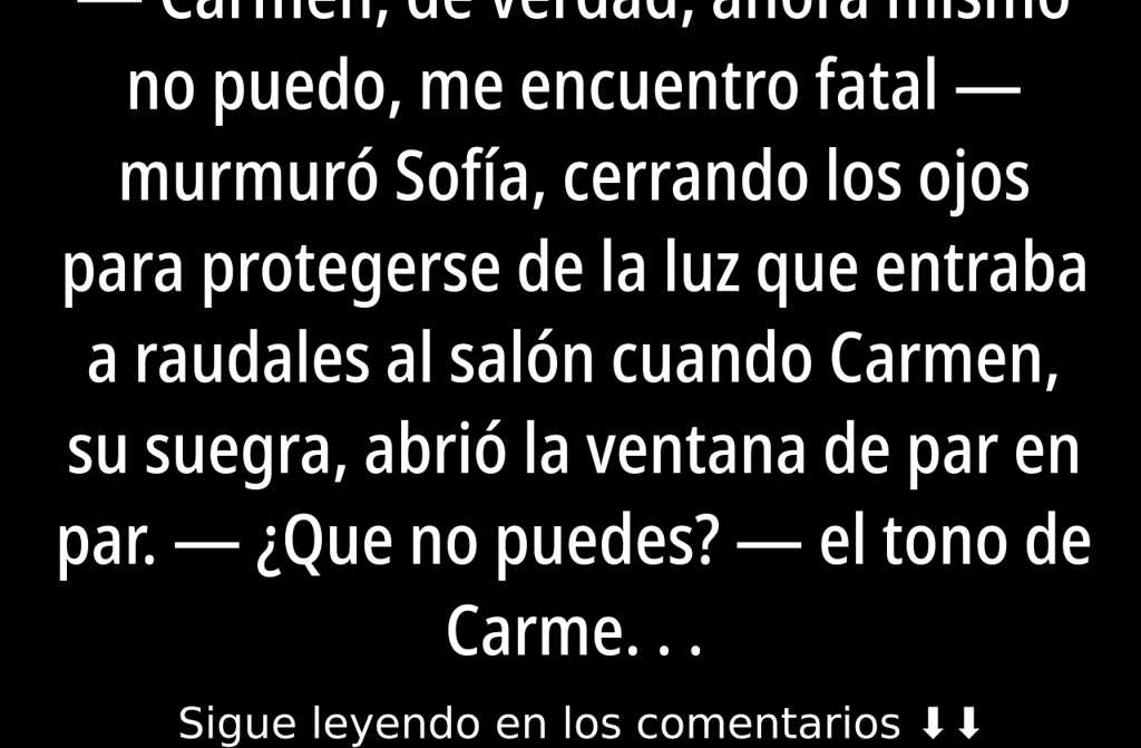 Carmen, de verdad, ahora mismo no puedo, me encuentro fatal murmuró Sofía, cerrando los ojos para protegerse de la luz que entraba a raudales al salón cuando Carmen, su suegra, abrió la ventana de par en par.