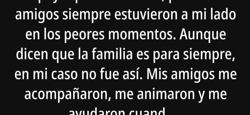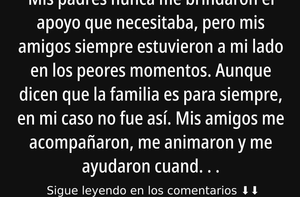 Mis padres nunca me brindaron el apoyo que necesitaba, pero mis amigos siempre estuvieron a mi lado en los peores momentos. Aunque dicen que la familia es para siempre, en mi caso no fue así. Mis amigos me acompañaron, me animaron y me ayudaron cuando más falta me hacía.