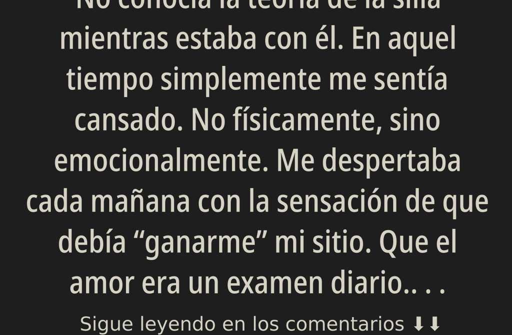 No conocía la teoría de la silla mientras estaba con él. En aquel tiempo simplemente me sentía cansado. No físicamente, sino emocionalmente. Me despertaba cada mañana con la sensación de que debía ganarme mi sitio. Que el amor era un examen diario.