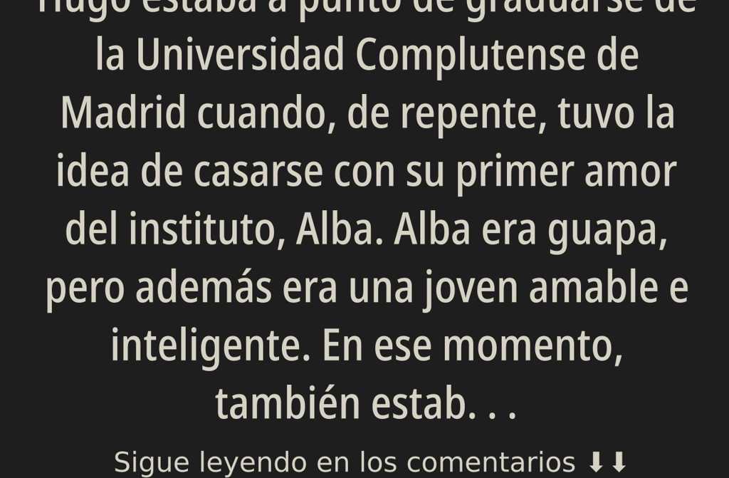 Hugo estaba a punto de graduarse de la Universidad Complutense de Madrid cuando, de repente, tuvo la idea de casarse con su primer amor del instituto, Alba. Alba era guapa, pero además era una joven amable e inteligente. En ese momento, también estaba terminando su tesis. Los dos acordaron casarse en cuanto terminaran sus trabajos.